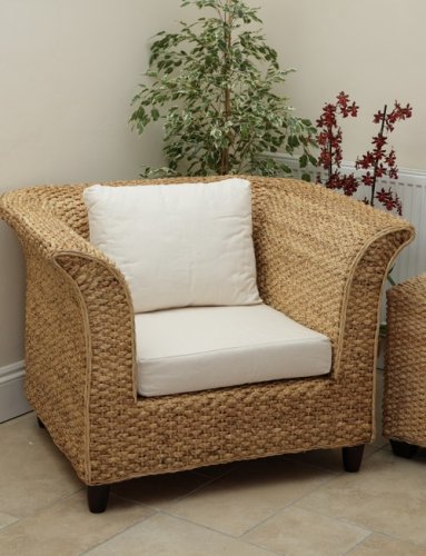 - These beautiful comfortable chairs / sofas are made from Water Hyancith (Eicchornia Crassipes). These free flowing aquatic plants of South American origin are collected, dried and plaited onto durable hardwood frames providing beautiful easy to maintain furniture with an excellent eco-friendly solution.